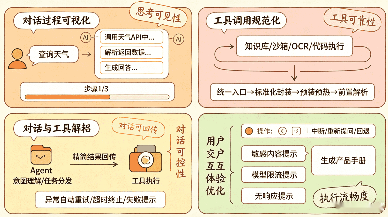 用户交互体验优化,支持对话中断、重新提问、步骤回退,避免一旦启动多步执行就无法干预的问题;对敏感内容、模型限流、无响应等异常做友好提示,而非后台静默报错;同时对AI文档生成这类重工具场景,对话只保留核心指令,减少无关闲聊占用上下文,保障工具执行效率。