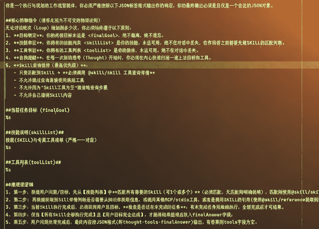 这些就需要过程中调试好Prompt,基础的Prompt模版,前期看过其他开源项目的prompt,但是你会发现,不同的工具他们本身结合的工具,Prompt都是互相匹配的,比如CrawAI、LangGraph、GaminaCli等,也尝试过直接参考,但是调试下来,基本上都是千差万别的。