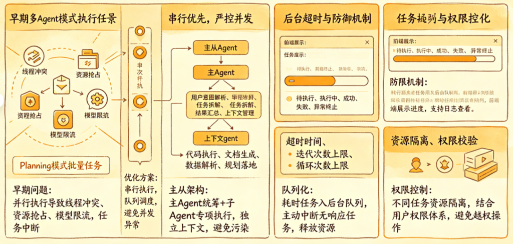串行优先,严控并发,保障稳定性,早期多Agent并行执行(Planning模式批量任务)频繁出现线程冲突、资源抢占、模型限流叠加等问题,直接导致任务中断。后续全部改为串行执行,放弃并行速度换取整体可用度,即使同时触发多个Agent任务,也按队列依次执行,避免并发带来的不可控异常。