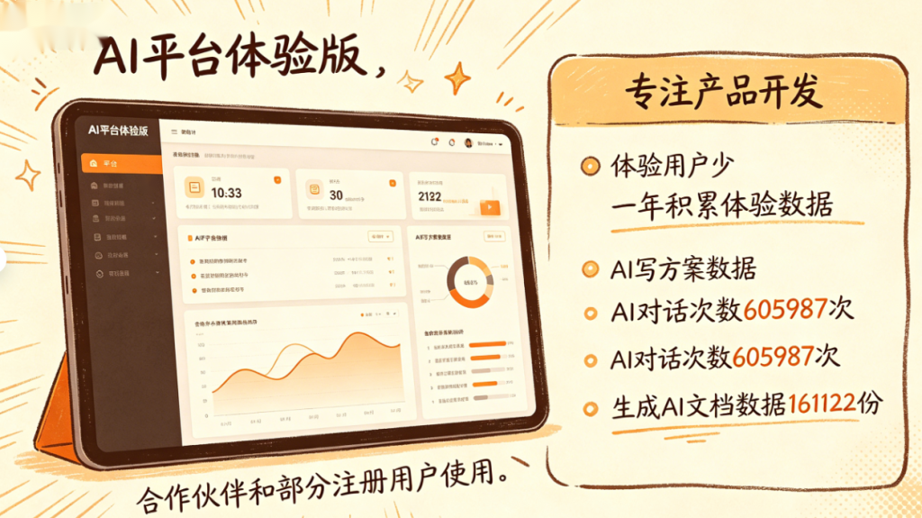 当前一直是AI平台体验版对外,更多是合作伙伴还有部分注册用户使用,前期一直专注于产品的开发,没有太多体验用户,在这一年里面积累下来的体验数据。这里拿了两个数据,一个是AI写方案的数据,一个是AI对话的,目前后台对话的次数是605987次,然后生成的AI文档数据是161122份。当然还有其它的场景,这里就不做统计。