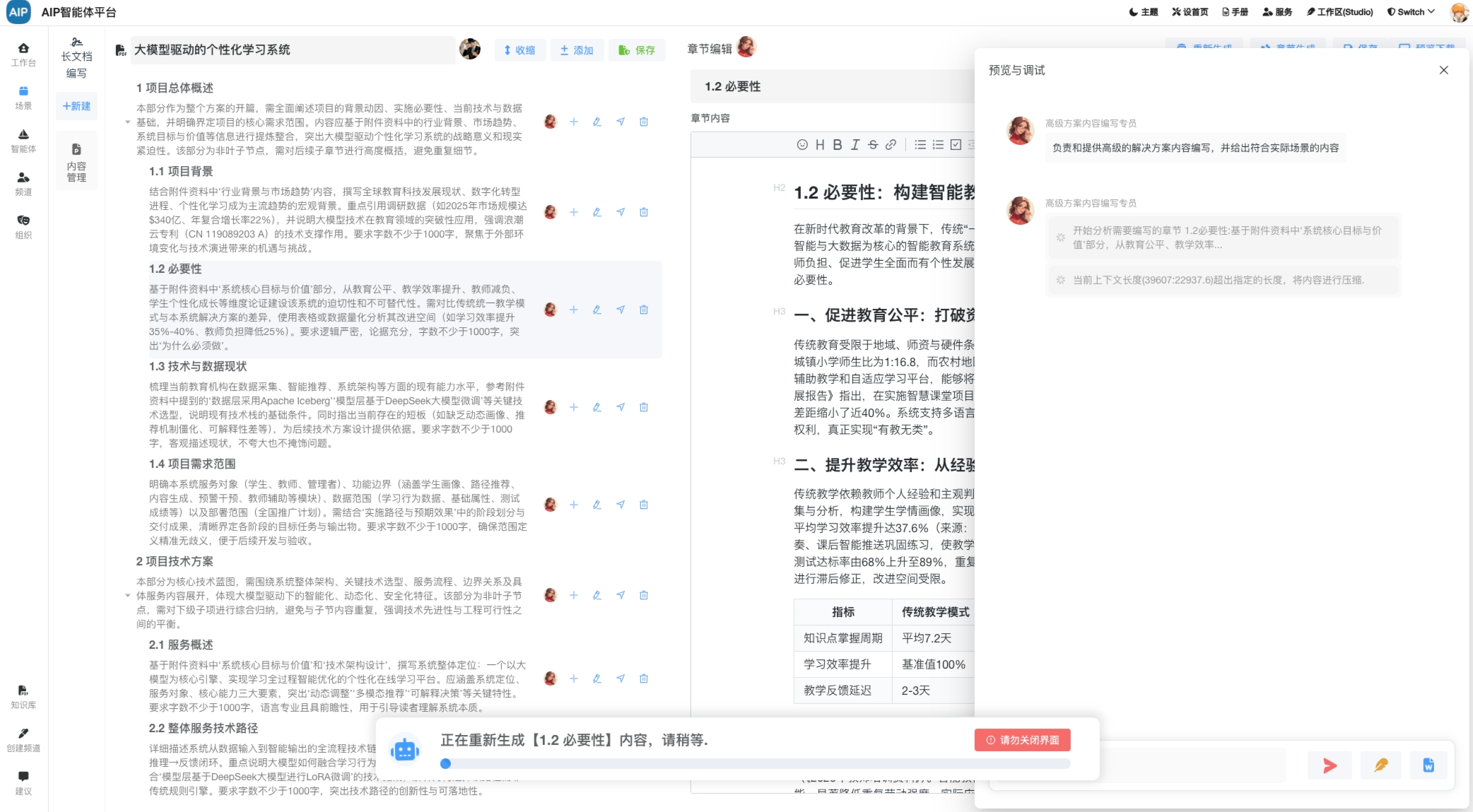 • 长文本形态:执行十几分钟或者1个小时的任务,超长文本的状态,场景主要是标书类型,可以整理成搞,而且每部分都可二次编辑。