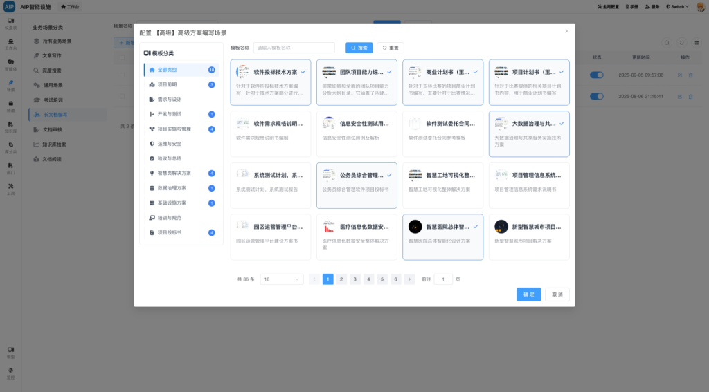 • 场景模板库:针对于不同的场景,在选择不同的模板输入与输出,会定向的指定结果的输出还有内容的形成,比如方案指定的输出结构。