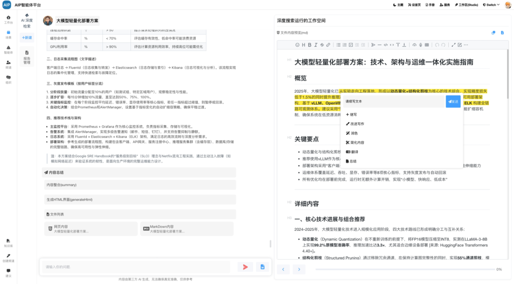 • 针对于长文本和深度搜索场景,结合AI编辑器的能力,可以在针对的结果上进行二次AI编辑和修改,同样也可以导出word;