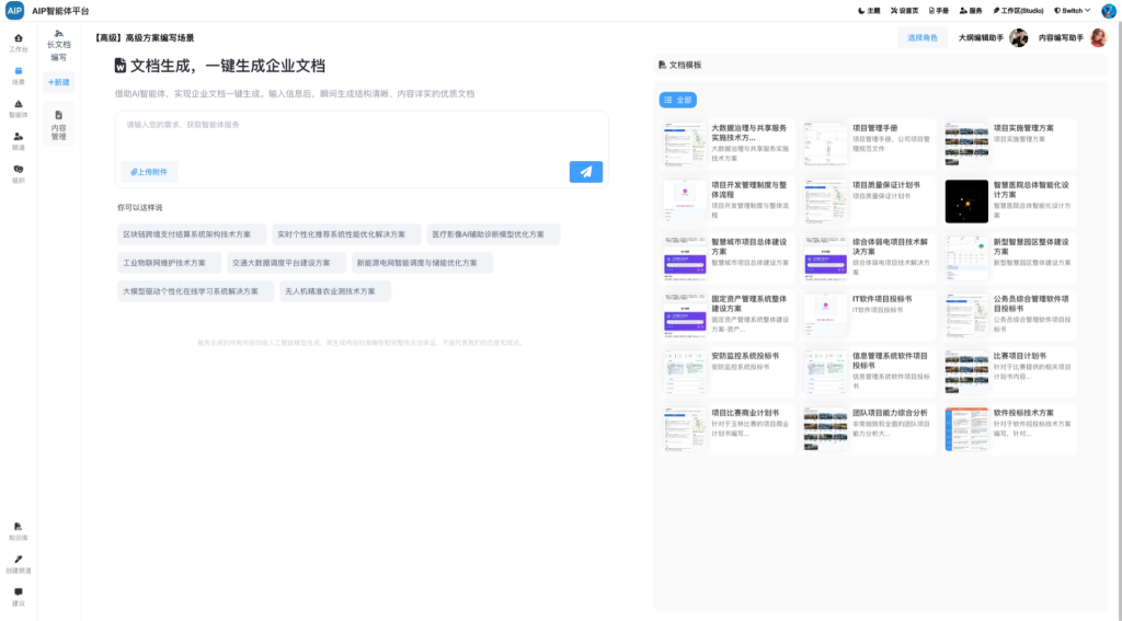• 配置多级别写文档场景: 针对于一般写文档场景和高级写文档的场景,对标的标书和一般的概要性文档,还有方案文档;