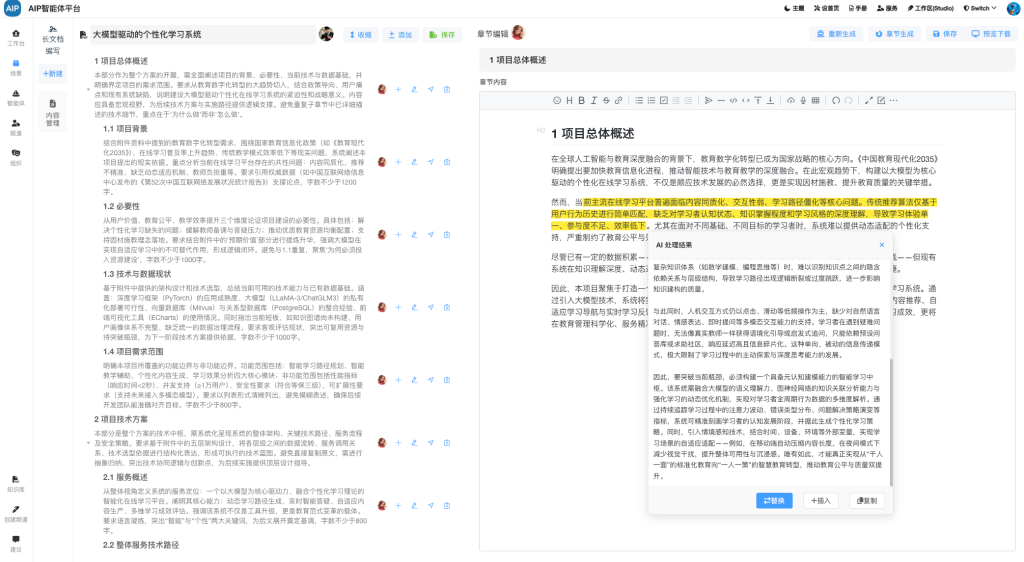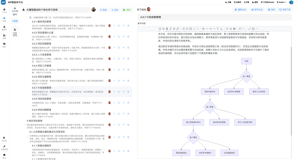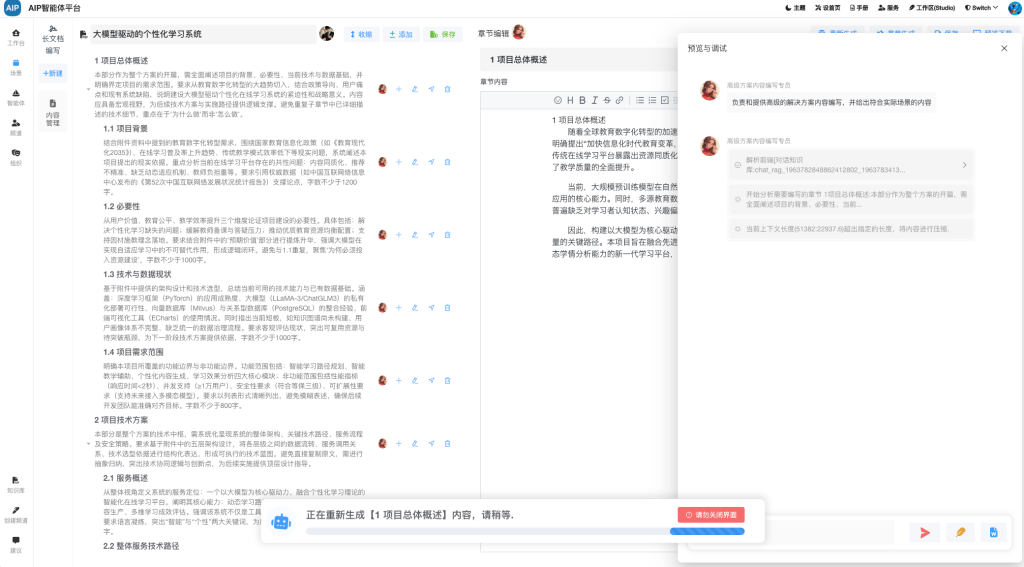 这个是AIP智能体在AI写文档落地实践解决了项目文档编写过程的场景。面对以往交付文档需要高级工程师耗时半天到一个月编写、新人难以快速上手、经常熬夜加班、内容质量参差不齐等问题,