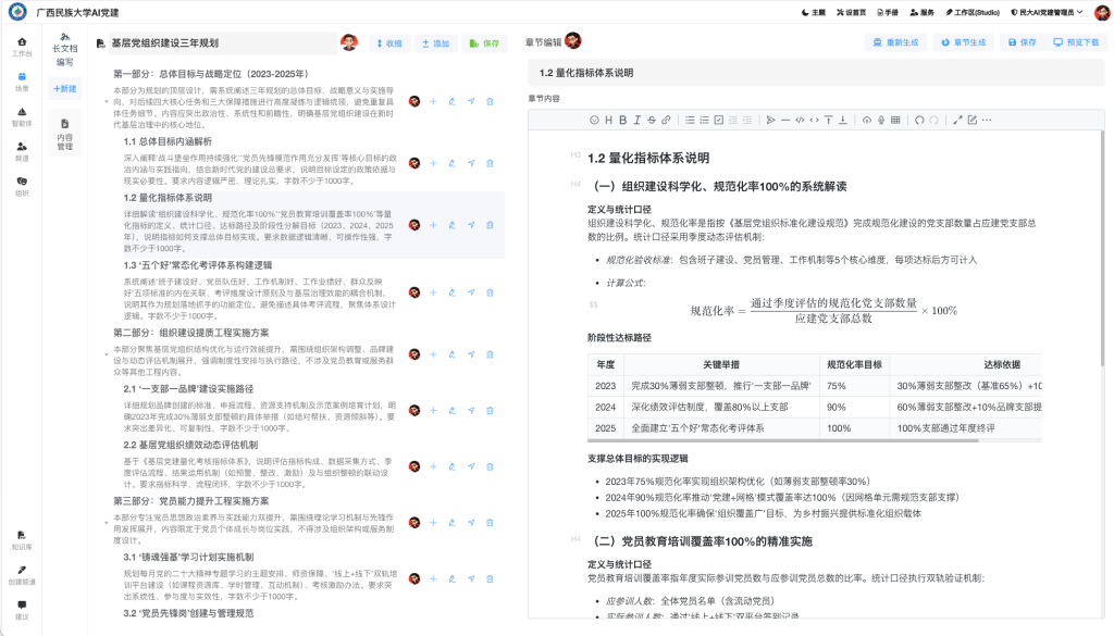 协助撰写《年度党建工作要点》、《主题教育实施方案》、《基层党组织建设三年规划》等大型文档,系统生成的规划草案结构更加完整,重要内容点的覆盖率显著提升。智能化的风险评估功能还有效提高了规划方案的可行性和稳健性。