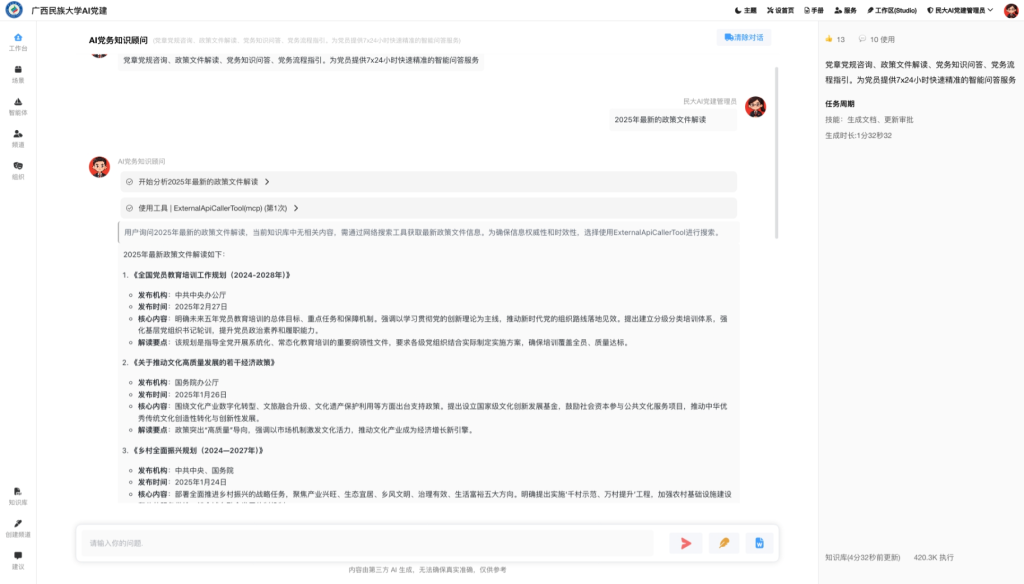 • AI党建规划: AI写方案,结合Rag知识库和私有化RagTool,同时与AI党务顾问多智能体结合