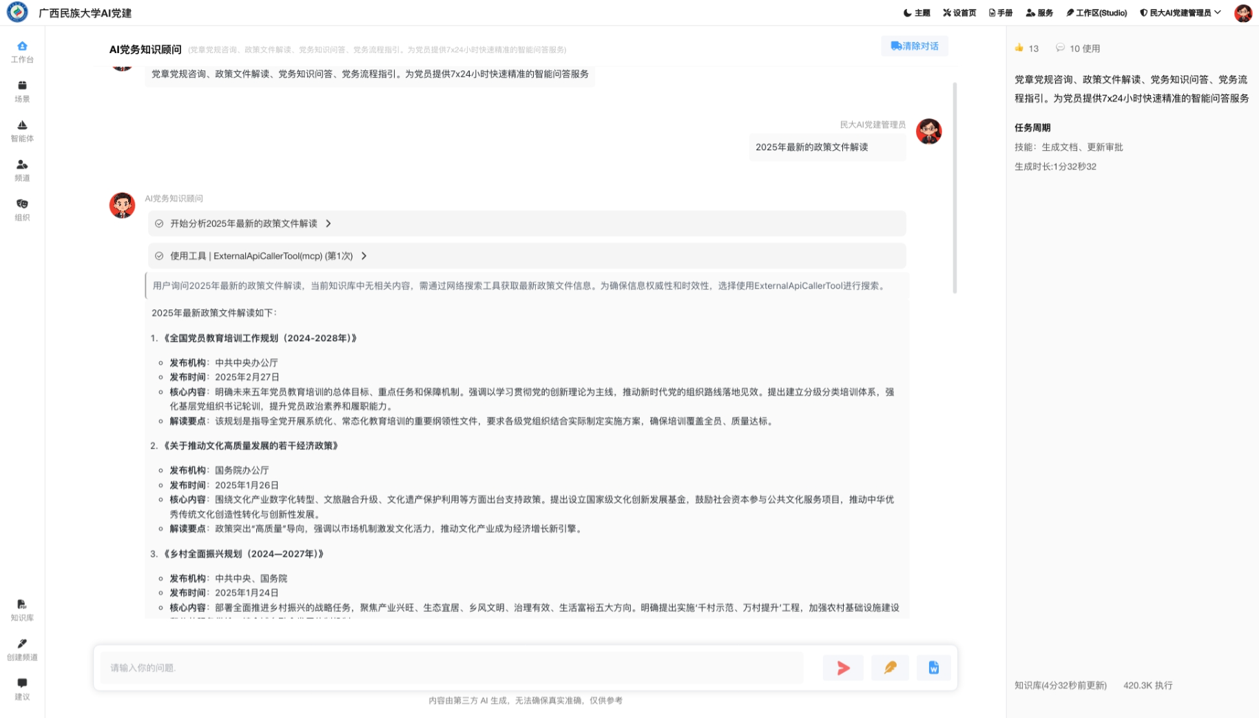 Agentic的模式结合,提供7×24小时快速精准的智能问答服务,显著提升党务咨询效率与准确性。