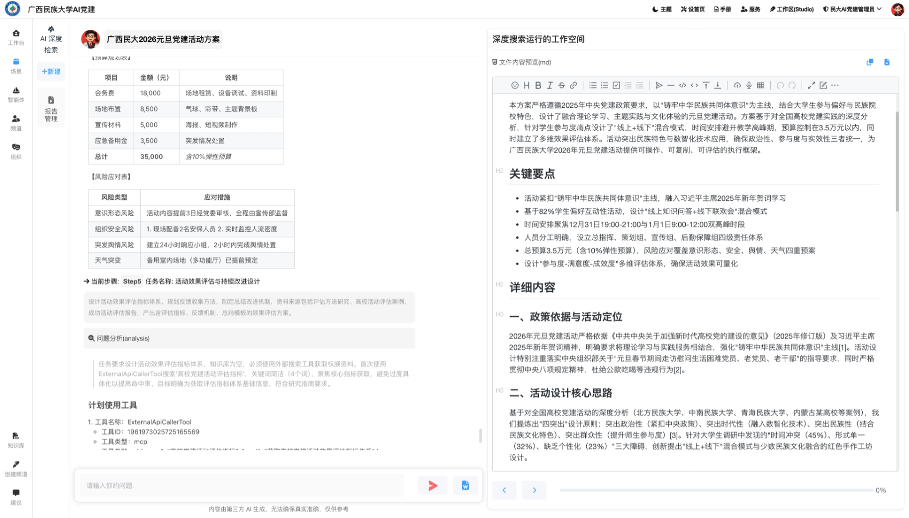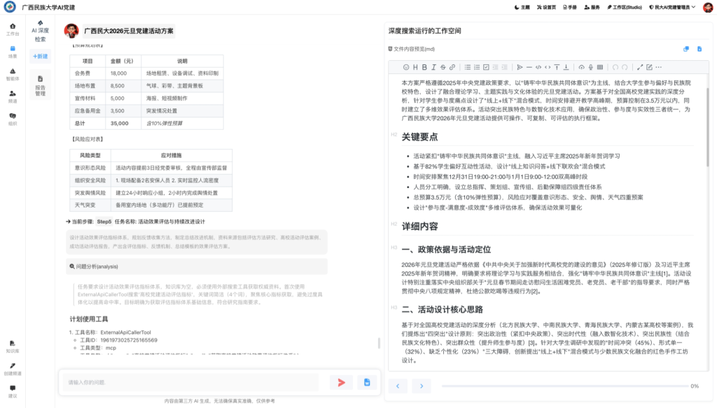 • AI党建策划: DeepSearch深度搜索与分步查询多结果形式展示(word/网页/markdown)
