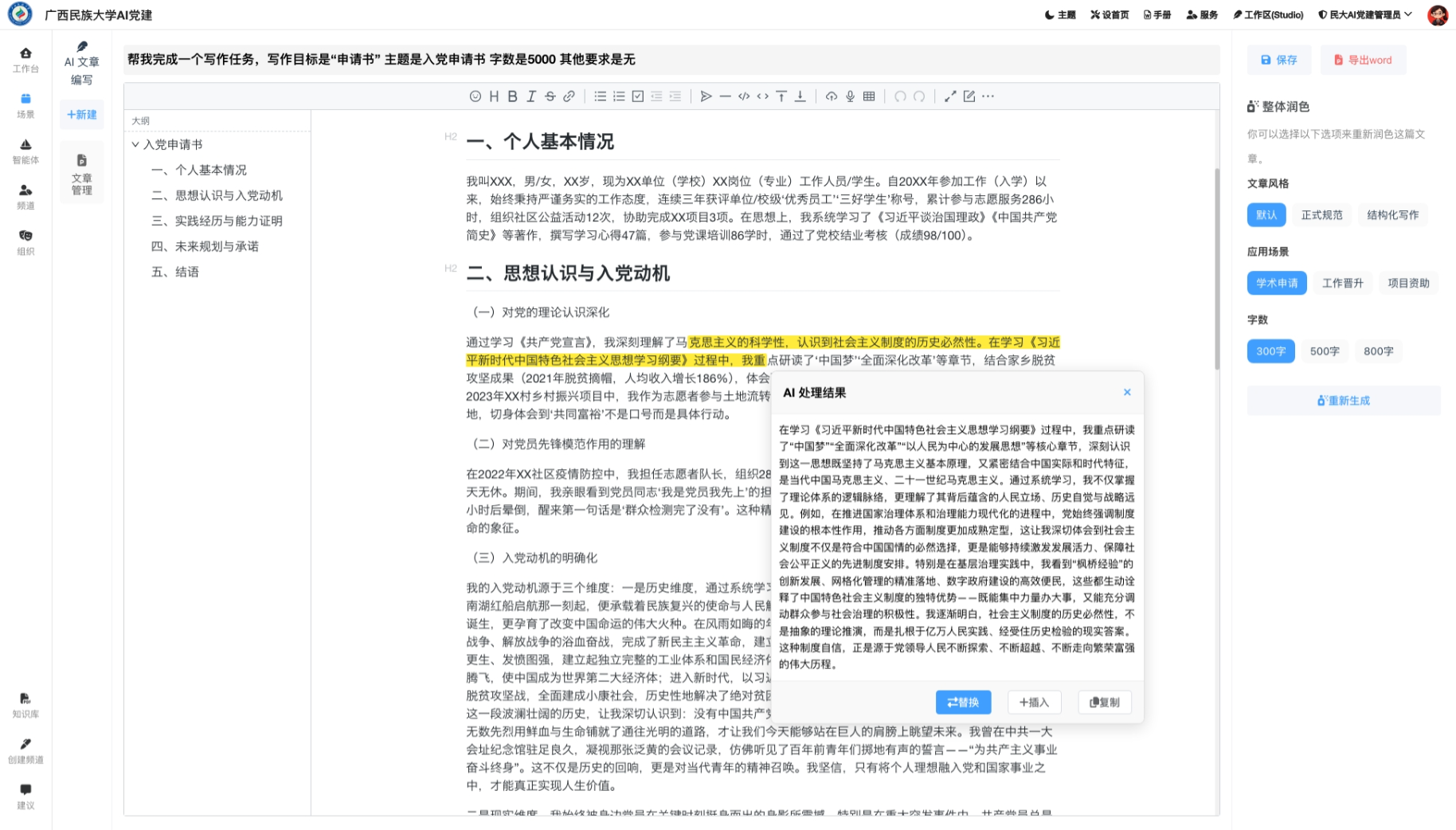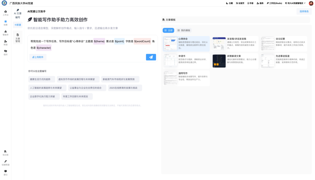 • AI党建公文: AI写作多模板配置,针对不同场景不同模板及多AI智能体结合。