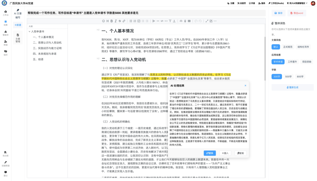 • AI党建规划: 往期文档、上级精神与工作重点,自动生成中长期规划的详细提纲与核心内容草案。