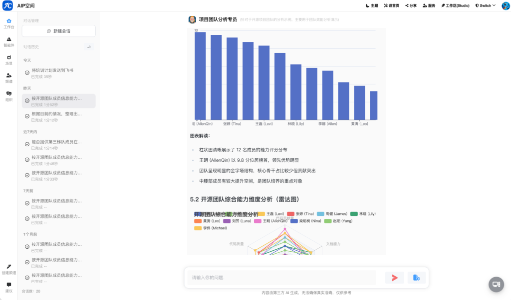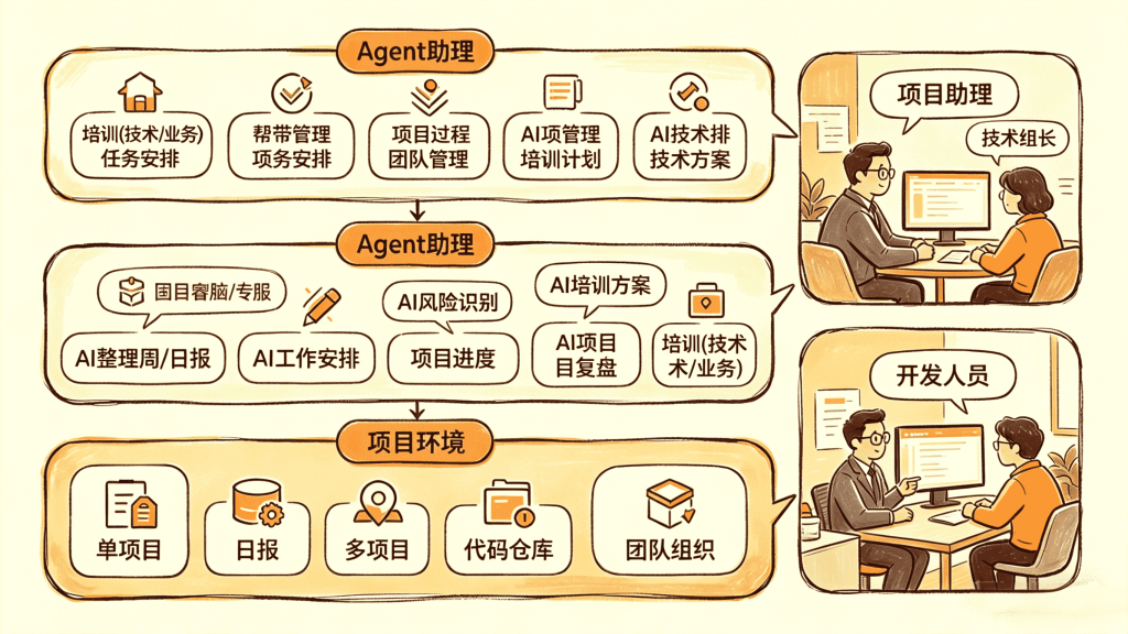 - 技术组长:AI 辅助识别项目风险、编排团队任务、生成技术方案、制定培训计划并完成阶段性项目复盘。