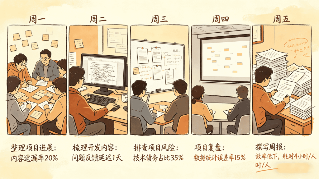 开发团队每周/每日需耗费大量时间整理项目进展、梳理开发内容、排查项目风险、项目整体复盘、撰写工作周报这些会比较耗时,有些情况下甚至需要半天来整理这些内容。