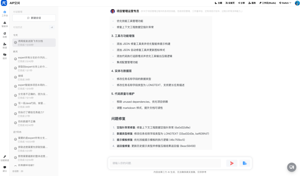 - Agent助理:AI整理周/日报、AI工作安排、AI风险识别、AI培训方案、AI项目复盘、AI培训计划、AI技术方案