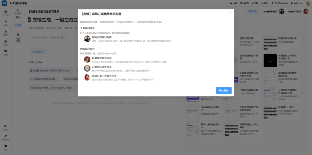 在使用的时候,直接上传需求或者对应的内容,然后输出方案的要求即可。内置角色模板(如需求分析专员、技术架构专员、实施方案专员等),按角色分工自动生成对应章节内容,支持多人并行协作与审阅流程。