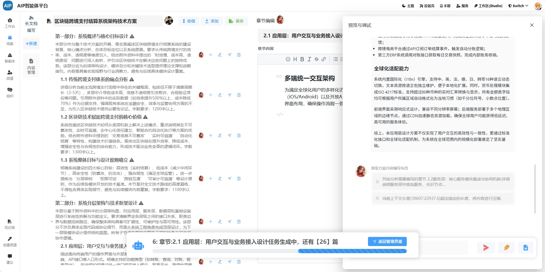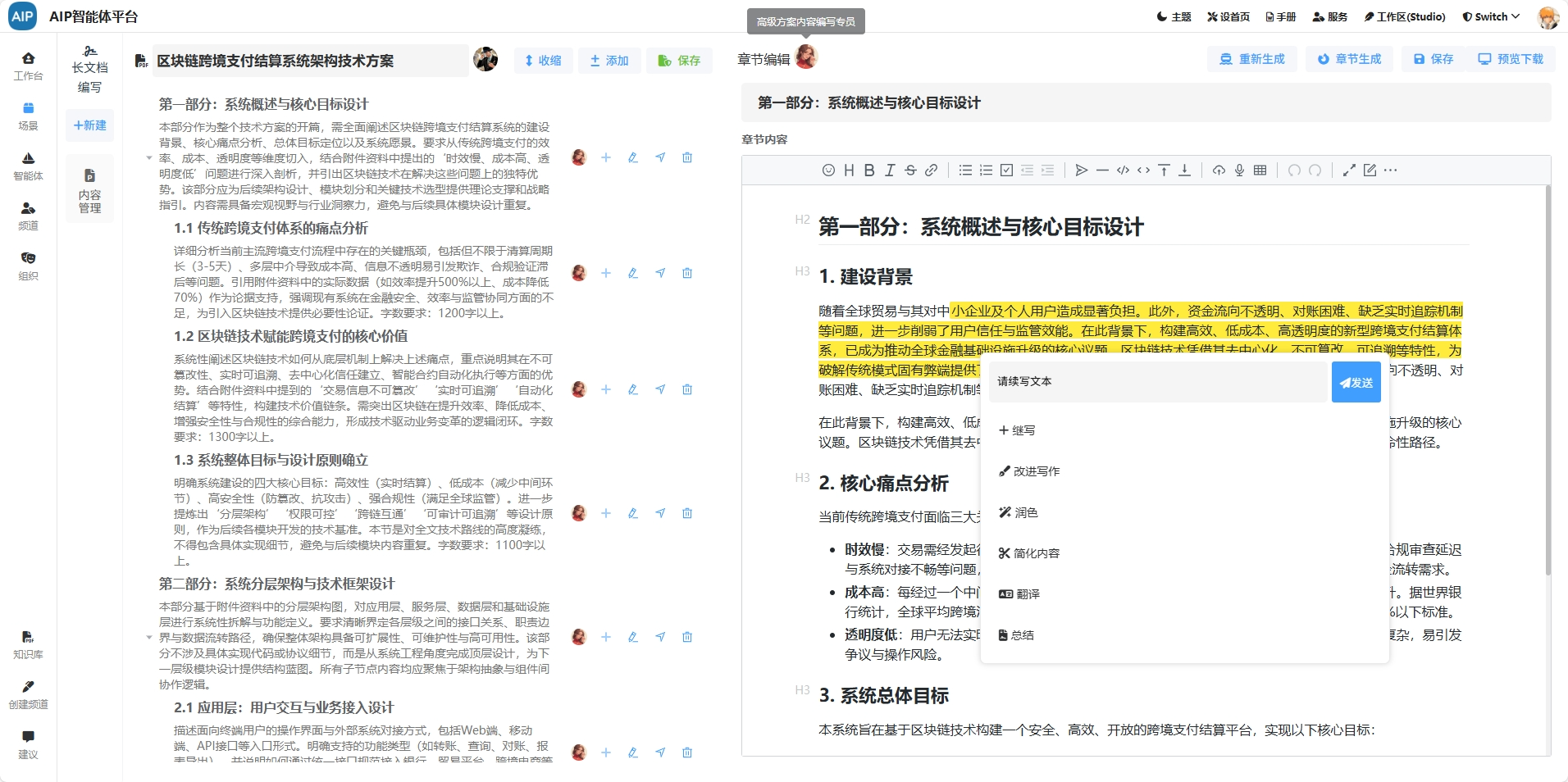 体系整合内外部知识库与 AI 插件能力,覆盖需求解析、框架生成、内容润色到合规定稿的全流程,通过多 Agent 协同实现分角色、分章节智能编写。