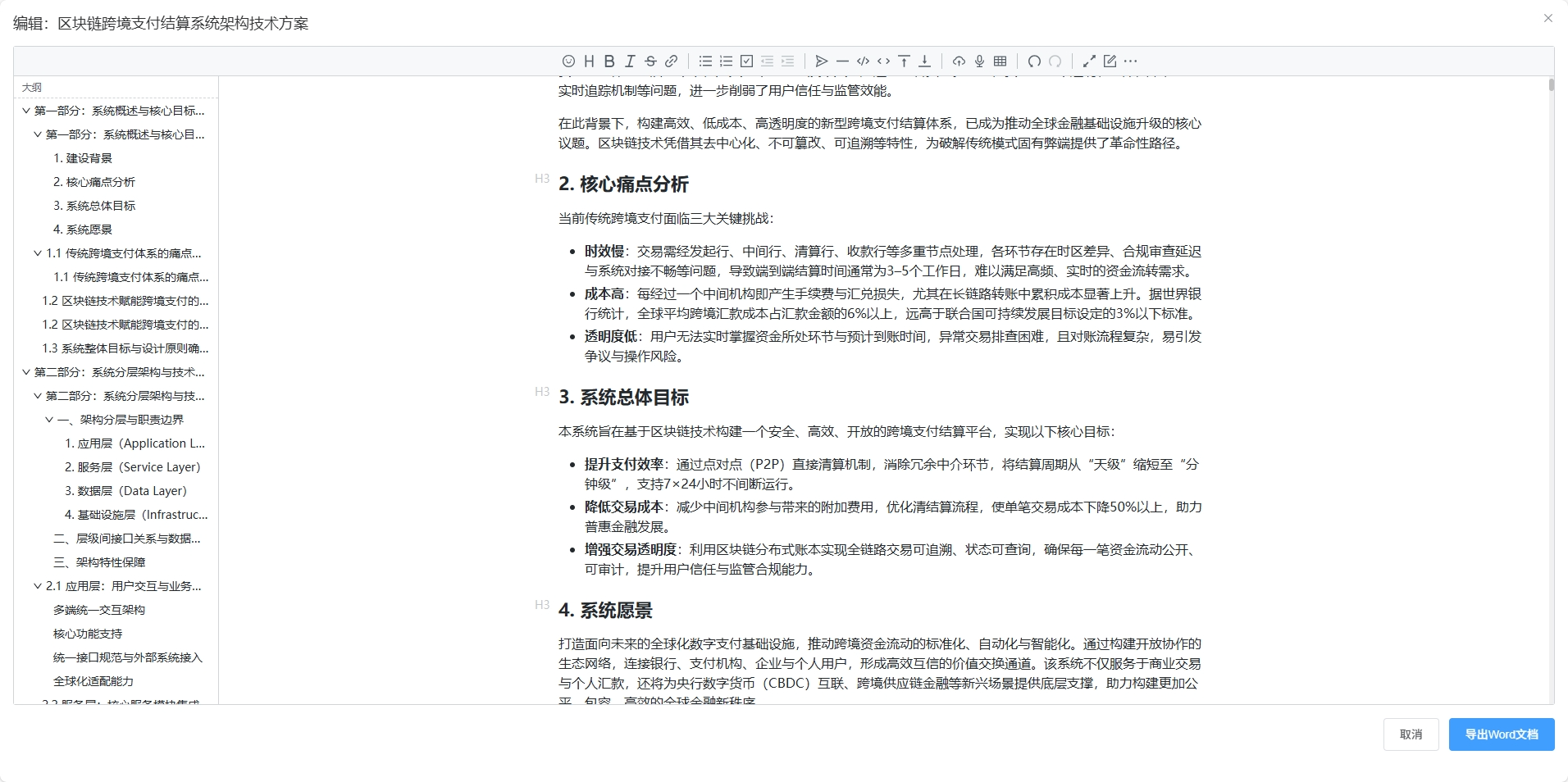 生成后的方案支持在线编辑、实时保存与版本管理,最终可导出为Word并保持与原文档结构一致,便于交付与归档。