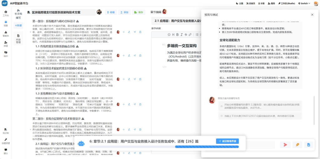AI在接收到需求之后,进行拆分、编写,过程可视化,用户在调整或提交资料后,文档处理与方案生成由后台异步任务执行,生成结果纳入统一任务管理平台,支持进度跟踪、重试、审计与统一检索。