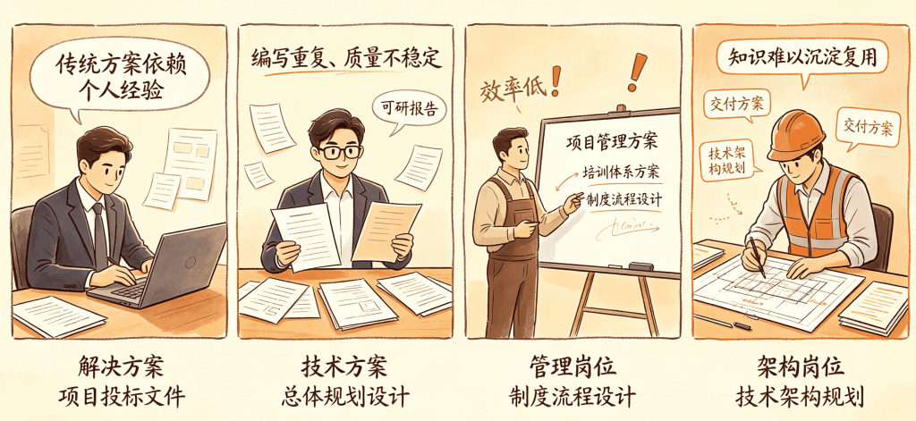 1. 业务场景:解决方案、项目标书、技术方案、规划设计、培训方案、管理方案