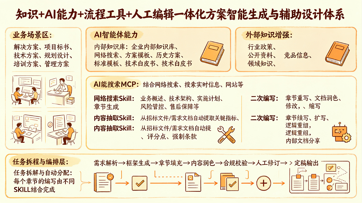 构建【“知识 + AI 能力 + 流程工具 + 人工编辑”一体化】的方案智能生成与辅助设计体系,实现从需求输入到方案输出的全链路 AI 增强,提升方案质量、标准化程度与交付效率。